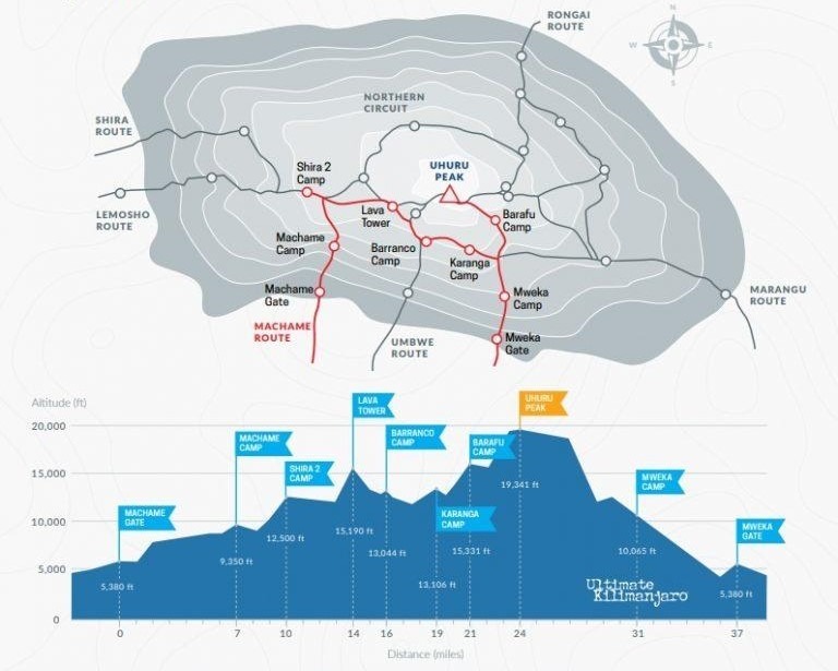 The Machame Route is one of the most scenic and popular routes on Mount Kilimanjaro. It takes climbers through diverse landscapes including rainforest, moorland, rocky ridges, and alpine desert. Known for its “climb high, sleep low” profile, it provides better acclimatization and a more adventurous trekking experience.