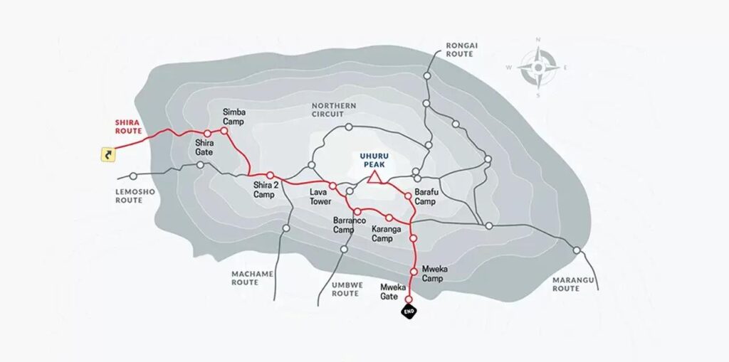 The Shira Route begins on the western side of Mount Kilimanjaro at a higher altitude compared to Lemosho. It offers spectacular views from the beginning and passes across the Shira Plateau, one of the most scenic areas on the mountain.